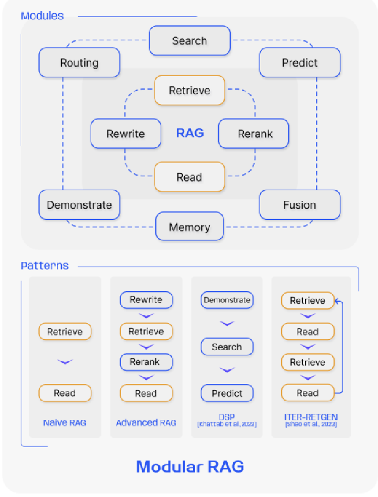 Modular RAG offers remarkable adaptability by allowing module substitution or reconfiguration to address specific challenges. This goes beyond the fixed structures of Naive and Advanced RAG, characterized by a simple “Retrieve” and “Read” mechanism. Moreover, Modular RAG expands this flexibility by integrating new modules or adjusting interaction flow among existing ones, enhancing its applicability across different tasks.
